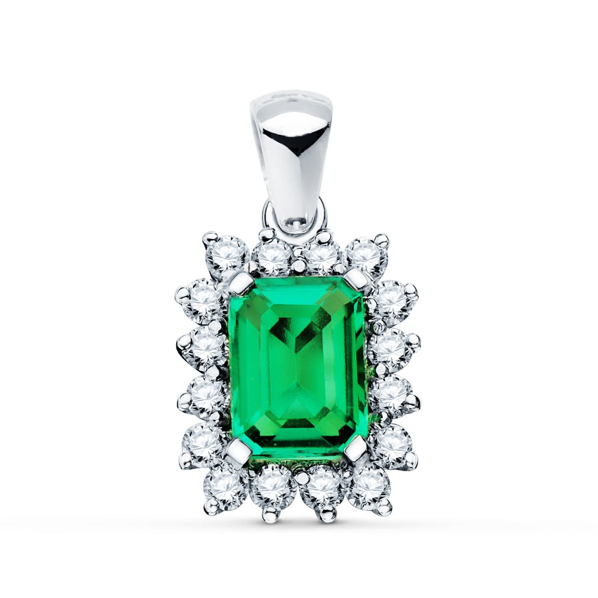 18K COLGANTE O.BLANCO ESMERALDA 1.50 QT. 16 DIAMANTES 0.56 QTS. SI-H. 13X11MM