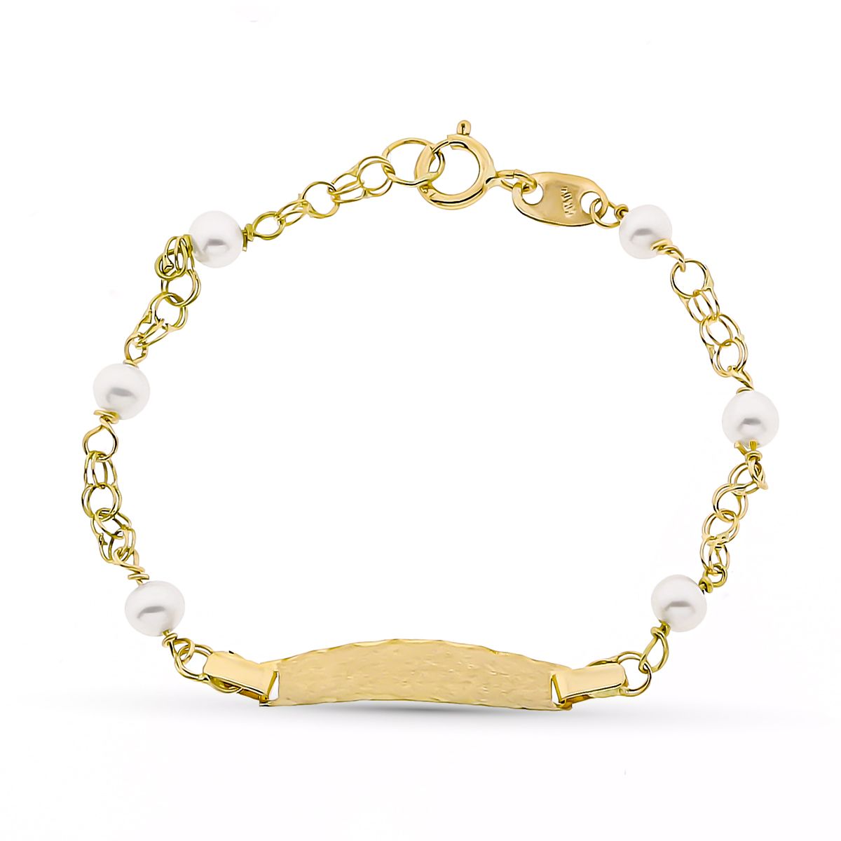 18K ESCLAVA ORO AMARILLO PERLAS 3 MM Y CADENA HUNGARA 12 CM. CHAPA 19 X 4 MM