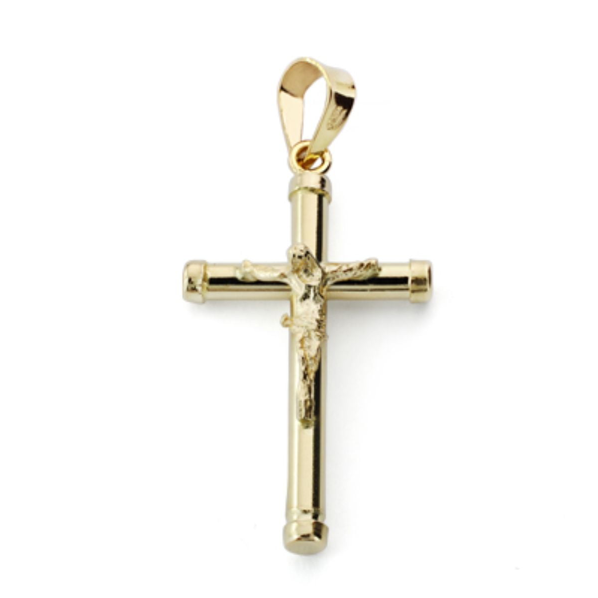 9K CRUZ DE TUBO HUECA ORO AMARILLO CON CRISTO 21 X 13 X 2 MM